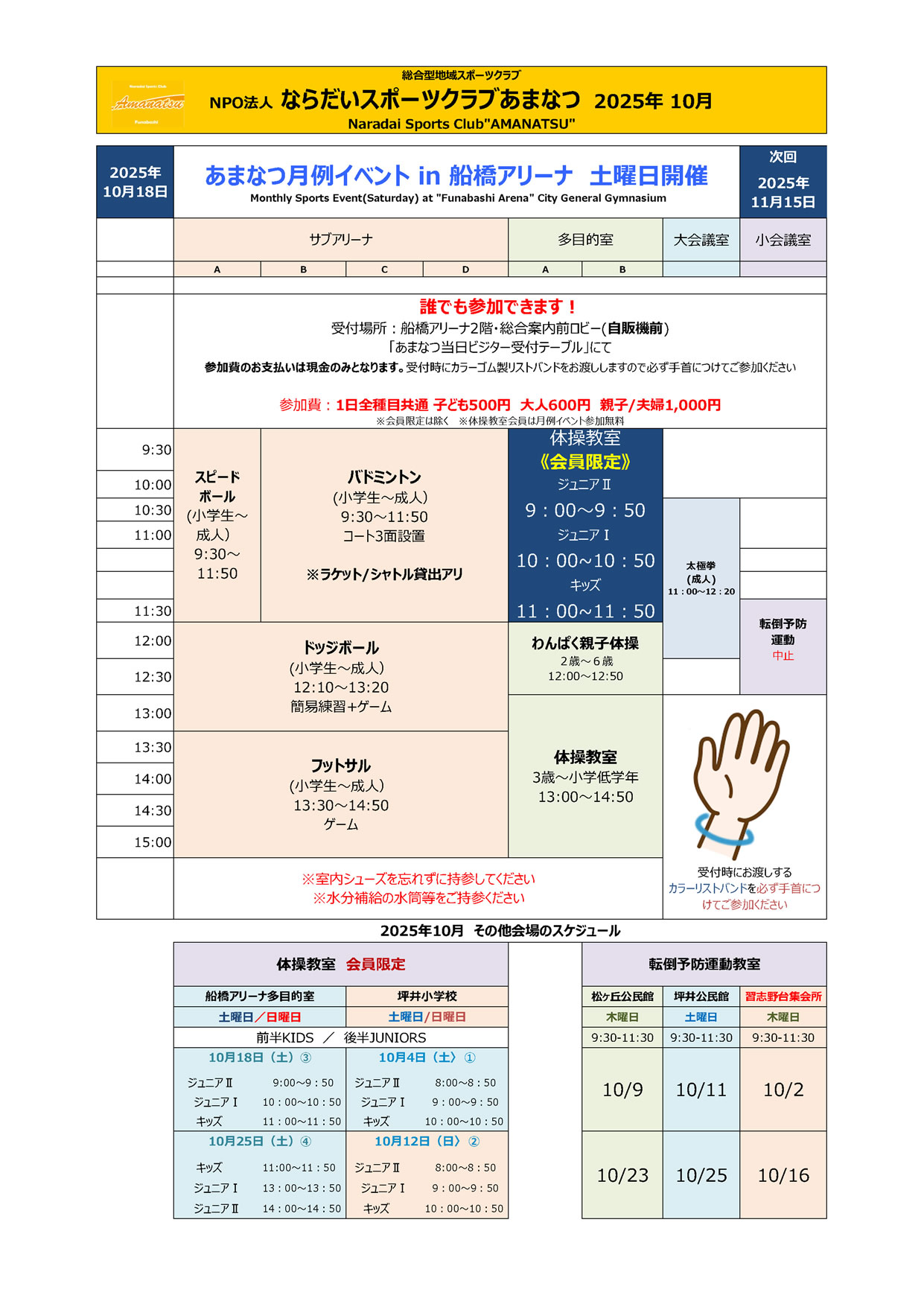 船橋アリーナ月例イベントは2025年10月18日(第3土曜日)に開催いたします。サブアリーナはスピードボール、バドミントン、ドッジボール、フットサルを開催します。多目的室では「会員制体操教室(午前中)」誰でも当日参加できる「親子体操」と「体操教室」を開催します。大会議室では「太極拳教室」を開催します。