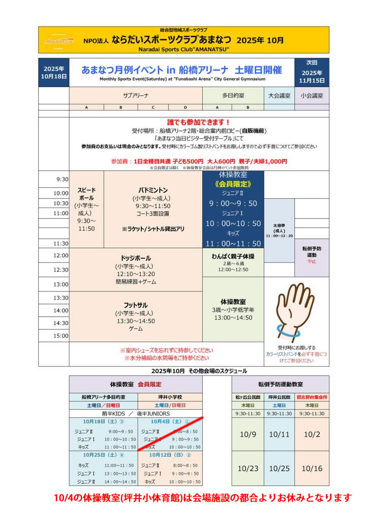 10/4の体操教室(坪井小)は会場施設の都合により全コース中止となりました