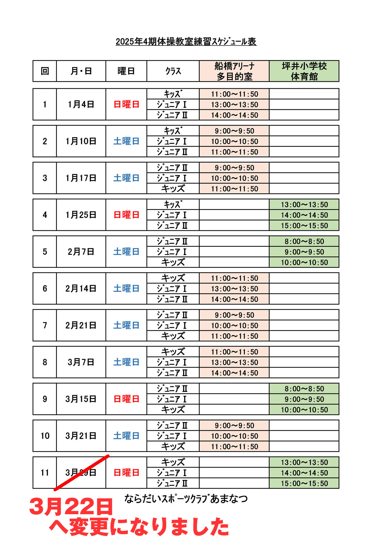 当クラブで会員制スクールとして実施している「体操教室」のスケジュール変更についてお知らせいたします。2026年3月29日は会場が学校行事の為、中止となります。3月22日(日)に振替え開催します。