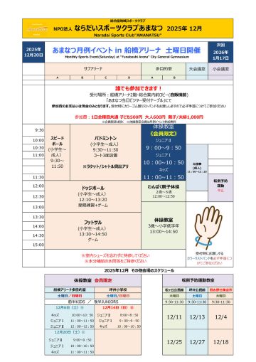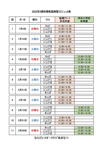 スケジュール 2024.09.172025.11.30 あまつな活動スケジュール表 船橋アリーナ月例 毎月の全活動日程公民館転倒予防etc 体操教室(会員制) 会員制スクール用体操教室/日程・会場 変更/中止の案内 参加当日に最新情報を必ず確認しましょう! ※公民館「転倒予防教室」のスケジュールは船橋アリーナ月例イベントのスケジュールを参照してください※習志野公民館の転倒予防教室は現在、臨時会場として習志野台団地自治会集会所にて開催