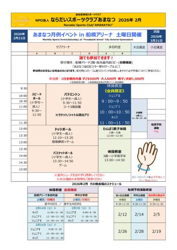 スケジュール 2024.09.172026.02.05 あまつな活動スケジュール表 船橋アリーナ月例 毎月の全活動日程公民館転倒予防etc 体操教室(会員制) 会員制スクール用体操教室/日程・会場 変更/中止の案内 参加当日に最新情報を必ず確認しましょう! ※公民館「転倒予防教室」のスケジュールは船橋アリーナ月例イベントのスケジュールを参照してください※習志野公民館の転倒予防教室は現在、臨時会場として習志野台団地自治会集会所にて開催